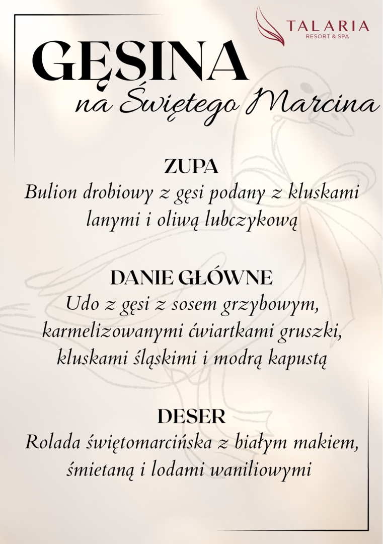 Od 7 do 11 listopada w naszej restauracji czeka na Was specjalne menu z gęsiną w roli głównej – przygotowaną z pasją, doprawioną sercem i podaną w nastrojowych wnętrzach Talarii. Poznajcie nasze autorskie dania, w których każdy składnik ma znaczenie, a każdy kęs opowiada historię kulinarnej miłości do polskiej tradycji. 💛